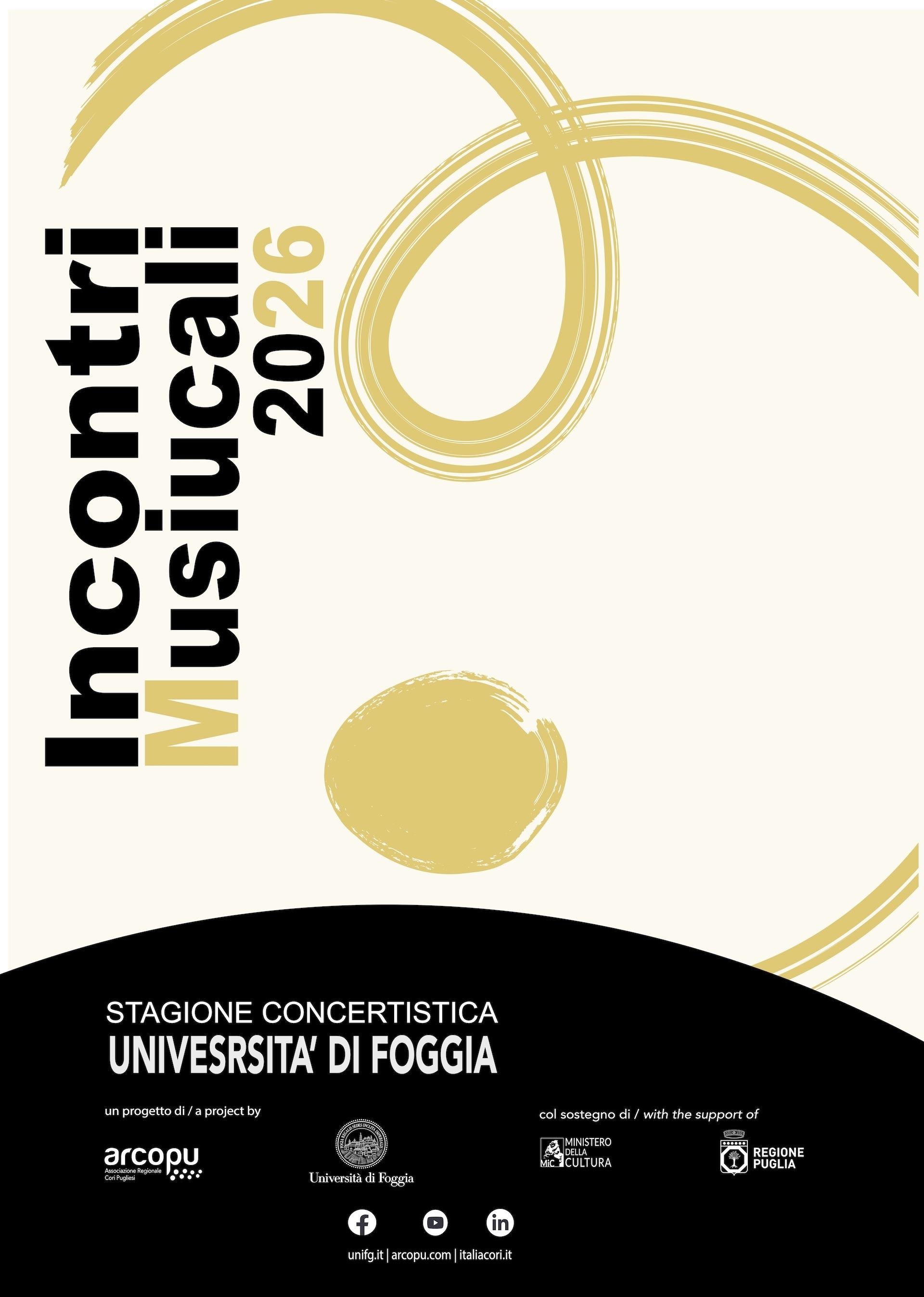 Incontri Musicali 2026 è la nuova stagione musicale ideata e realizzata da ARCoPu in collaborazione con l’Università di Foggia, che prende avvio nel 2026 per la prima volta, con l’obiettivo di offrire alla comunità universitaria e al territorio un percorso di ascolto, riflessione e incontro attraverso il linguaggio universale della musica. Ispirandosi a modelli virtuosi di dialogo tra musica e sapere, la rassegna si configura come uno spazio di contaminazione tra discipline, culture e linguaggi, capace di affiancare alla formazione accademica un’esperienza culturale aperta, inclusiva e multidimensionale. Concerti, incontri e momenti di approfondimento diventano occasioni per mettere in relazione la musica con la storia, le scienze sociali, l’antropologia, la filosofia e le dinamiche contemporanee della società globale. Il tema dell’edizione inaugurale, Armonie globali. Dialoghi e intercultura in musica, pone al centro il valore della musica come strumento di dialogo tra popoli, tradizioni e identità, capace di superare confini geografici e culturali. I programmi proposti esplorano repertori, esperienze e pratiche musicali provenienti da diversi contesti del mondo, valorizzando la pluralità delle espressioni artistiche e il confronto tra tradizione e contemporaneità. Incontri Musicali 2026 si propone così come un laboratorio culturale permanente, in cui l’università diventa luogo di ascolto, partecipazione e apertura, e la musica si afferma come veicolo privilegiato di intercultura, cittadinanza attiva e crescita collettiva. Un progetto che intende contribuire alla formazione di una comunità consapevole, curiosa e capace di leggere la complessità del presente attraverso l’arte dei suoni.