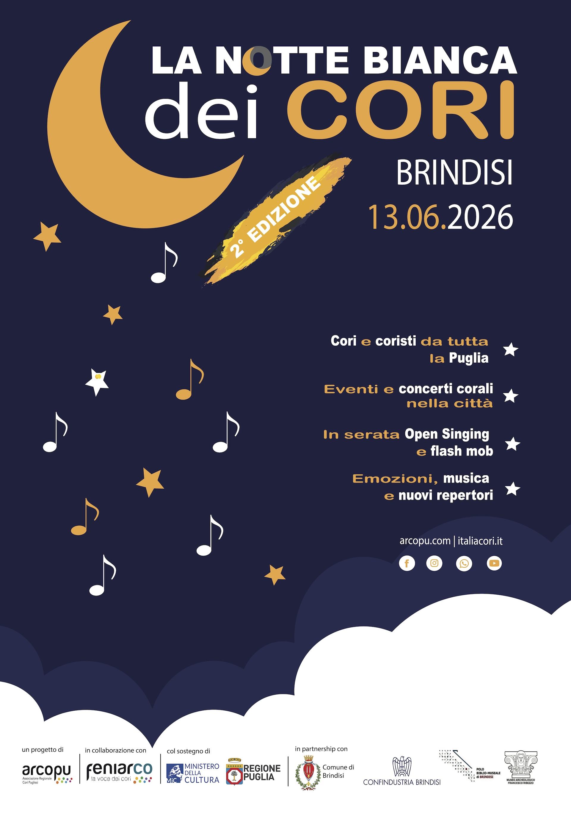 La Notte Bianca dei Cori 2026 è la seconda edizione dell’appuntamento regionale della coralità promosso e realizzato da ARCoPu: un grande evento diffuso che celebra il canto corale come esperienza artistica, culturale e comunitaria. È una manifestazione fuori dagli schemi in cui i veri protagonisti sono i cori, la forza comunicativa della loro musica, il piacere dell’incontro, la festa e la condivisione. Per un pomeriggio e una sera, Brindisi si trasforma in un palcoscenico a cielo aperto: spazi monumentali e luoghi simbolici della città accolgono le esibizioni, creando un percorso sonoro che intreccia arte, cultura e socialità. La Notte Bianca dei Cori è molto più di una rassegna: è un’esperienza collettiva che mette in rete generazioni, territori e repertori diversi, valorizzando il patrimonio corale pugliese e rafforzando il senso di comunità attraverso la musica.