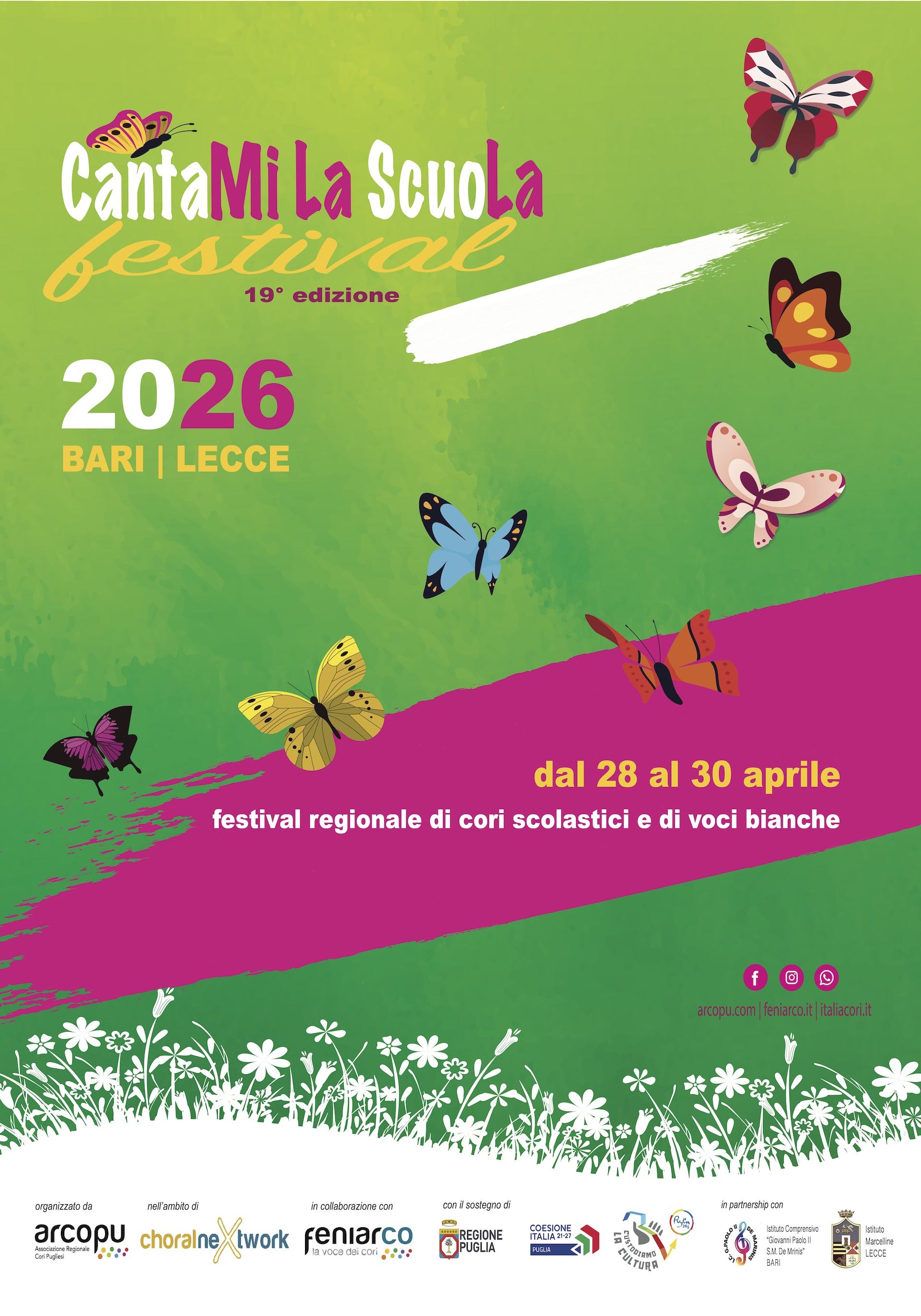 CantaMi La ScuoLa Festival è considerato l'appuntamento regionale della coralità scolastica. Si tratta di un festival che giunge alla sua 19° edizione ed è organizzato da ARCoPu in collaborazione con Feniarco, con il sostegno della Regione Puglia e del Ministero della Cultura. CantaMi La ScuoLa Festival è l'appuntamento per chi ama far risuonare le aule e i corridoi della propria scuola di canto e di musica. E dallo scorso anno il festival si fa in due perchè da Bari si sposta a Lecce proponendo l'impianto del festival in due luoghi differenti permettendo così ad un sempre maggior numero di formazioni di vivere tale esperienza e per l'occasione cambia veste grafica.