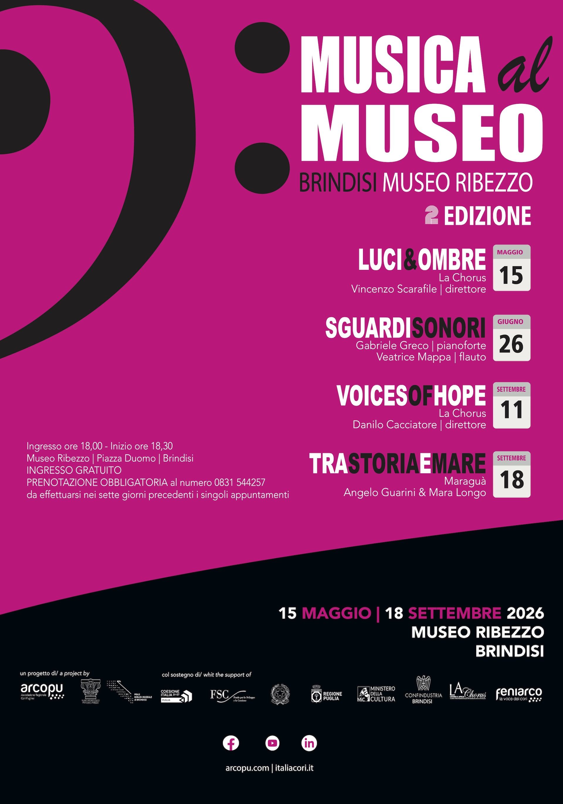 Musica al Museo è la stagione  concertistica che anima gli spazi del Museo Archeologico Provinciale “Francesco Ribezzo” di Brindisi, trasformando uno dei luoghi più significativi del patrimonio storico della città in un punto d’incontro tra musica e cultura. Il progetto, giunto nel 2026 alla sua seconda edizione, nasce con l’intento di far dialogare la grande tradizione musicale con il patrimonio archeologico custodito nel museo, intitolato all’archeologo e glottologo Francesco Ribezzo (1875–1952) e noto per importanti reperti come i preziosi vasi attici e i celebri Bronzi di Punta del Serrone. La stagione propone un percorso artistico variegato e di qualità, capace di attraversare epoche e linguaggi musicali diversi: dal repertorio antico alla musica gospel, dal pop alla musica da camera. In questo contesto suggestivo, il museo diventa non solo luogo di conservazione della memoria storica, ma anche spazio vivo di produzione culturale, in cui la musica dialoga con le opere e con l’architettura del luogo, offrendo al pubblico un’esperienza artistica immersiva. La stagione si rivolge alla comunità brindisina e al pubblico proveniente da tutto il territorio regionale, contribuendo a rafforzare il ruolo del Museo Ribezzo come polo culturale dinamico e aperto alla città.
