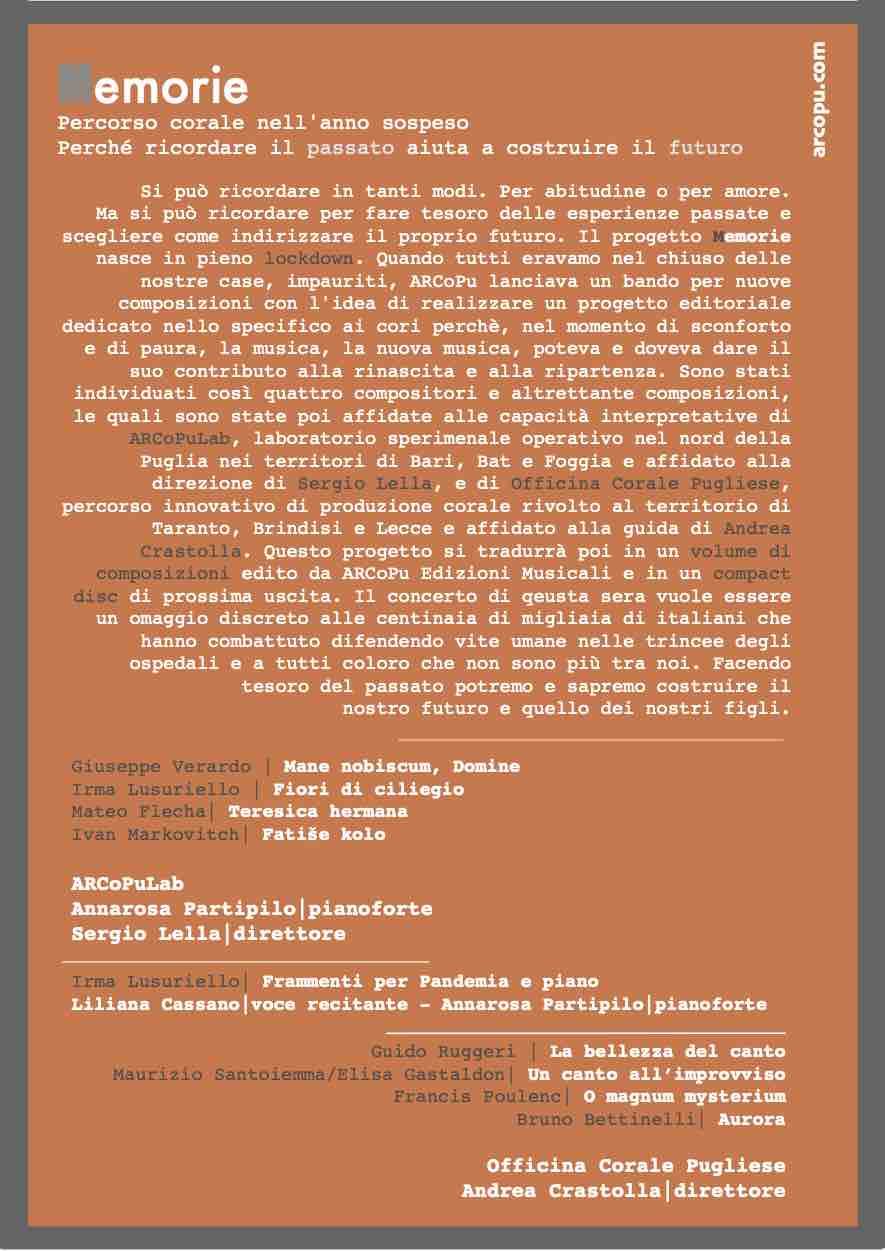Si può ricordare in tanti modi. Per abitudine o per amore. Ma si può ricordare per fare tesoro delle esperienze passate e scegliere come indirizzare il proprio futuro. Il progetto Memorie nasce in pieno lockdown. Quando tutti eravamo nel chiuso delle nostre case, impauriti, ARCoPu lanciava un bando per nuove composizioni con l'idea di realizzare un progetto editoriale dedicato nello specifico ai cori perchè, nel momento di sconforto e di paura, la musica, la nuova musica, poteva e doveva dare il suo contributo alla rinascita e alla ripartenza. Sono stati individuati così quattro compositori, (Irma Lusuriello, Guido Ruggieri, Maurizio Santoiemma e Giuseppe Verardo)  e altrettante composizioni, le quali sono state poi affidate alle capacità interpretative di ARCoPuLab, laboratorio sperimenale operativo nel nord della Puglia nei territori di Bari, Bat e Foggia e affidato alla direzione di Sergio Lella, e di Officina Corale Pugliese, percorso innovativo di produzione corale rivolto al territorio di Taranto, Brindisi e Lecce e affidato alla guida di Andrea Crastolla. Questo progetto si tradurrà poi in un volume di composizioni edito da ARCoPu Edizioni Musicali e in un compact disc di prossima uscita. Il concerto di Fasano di Sabato 17 ottobre 2020 vuole essere un omaggio discreto alle centinaia di migliaia di italiani che hanno combattuto difendendo vite umane nelle trincee degli ospedali e a tutti coloro che non sono più tra noi. Facendo tesoro del passato potremo e sapremo costruire il nostro futuro e quello dei nostri figli.